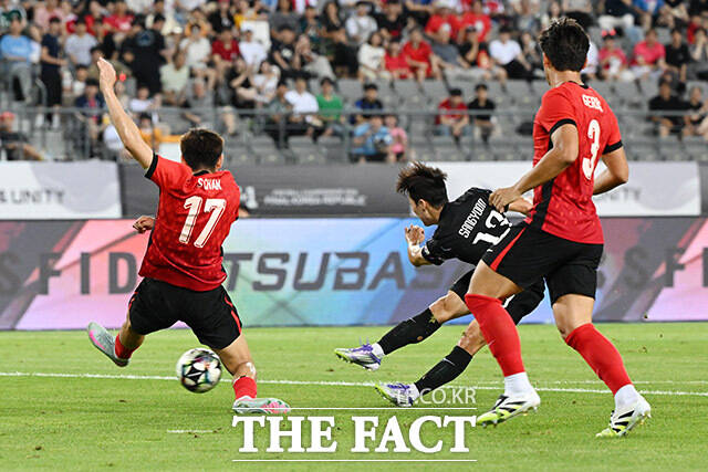[더팩트ㅣ용인미르스타디움=남용희 기자] 대한민국과 홍콩의 동아시아축구연맹(EAFF) E-1 챔피언십(동아시안컵) 경기가 11일 오후 경기 용인시 용인미르스타디움에서 열린 가운데 강상윤(가운데)의 슈팅이 홍콩 골망을 향하고 있다.