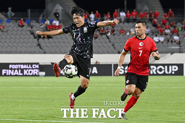 [더팩트ㅣ용인미르스타디움=남용희 기자] 대한민국과 홍콩의 동아시아축구연맹(EAFF) E-1 챔피언십(동아시안컵) 경기가 11일 오후 경기 용인시 용인미르스타디움에서 열린 가운데 나상호가 트래핑을 시도하고 있다.