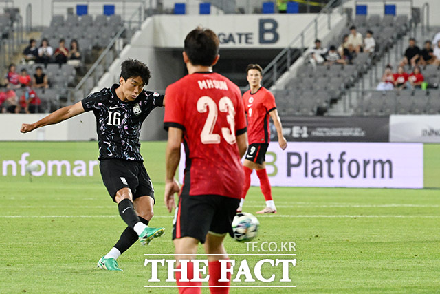 [더팩트ㅣ용인미르스타디움=남용희 기자] 대한민국과 홍콩의 동아시아축구연맹(EAFF) E-1 챔피언십(동아시안컵) 경기가 11일 오후 경기 용인시 용인미르스타디움에서 열린 가운데 서명관이 슈팅을 시도하고 있다.