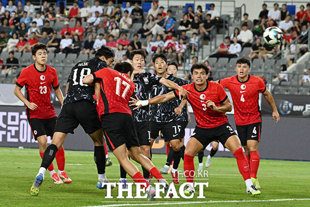 [더팩트ㅣ용인미르스타디움=남용희 기자] 대한민국과 홍콩의 동아시아축구연맹(EAFF) E-1 챔피언십(동아시안컵) 경기가 11일 오후 경기 용인시 용인미르스타디움에서 열린 가운데 이호재(왼쪽 두 번째)가 헤더를 시도하고 있다.