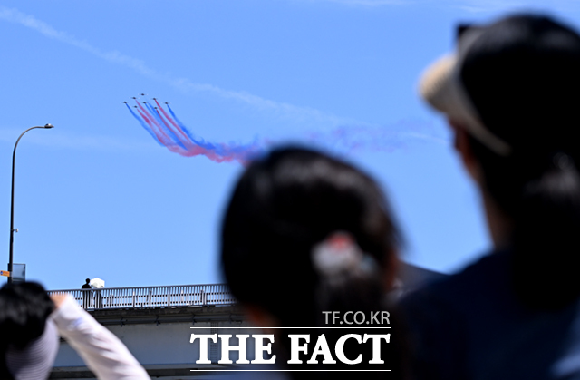 [더팩트ㅣ이새롬 기자] 12일 서울 서초구 반포한강공원 일대에서 제 1회 방위산업의 날 제정(7월 8일)을 기념해 시민 참여 페스티벌 행사가 열린 가운데, 공군 특수비행팀 블랙이글스가 축하 비행을 하고 있다.