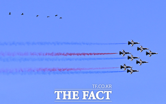 [더팩트ㅣ이새롬 기자] 12일 서울 서초구 반포한강공원 일대에서 제 1회 방위산업의 날 제정(7월 8일)을 기념해 시민 참여 페스티벌 행사가 열린 가운데, 공군 특수비행팀 블랙이글스가 축하 비행을 하고 있다.