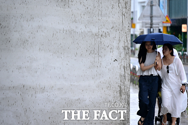 [더팩트ㅣ남윤호 기자] 13일 오후 서울 종로구 창성동 거리에서 쏟아지는 빗방울로 한 건물 벽면이 젖고 있다.