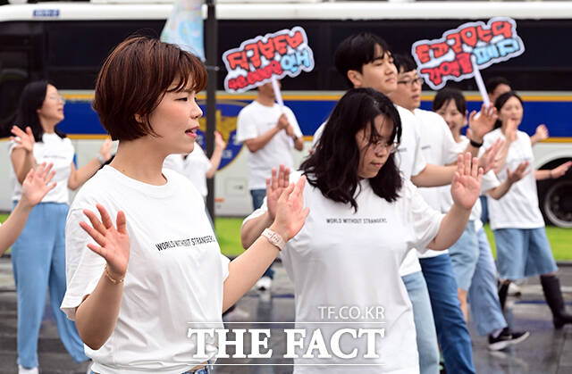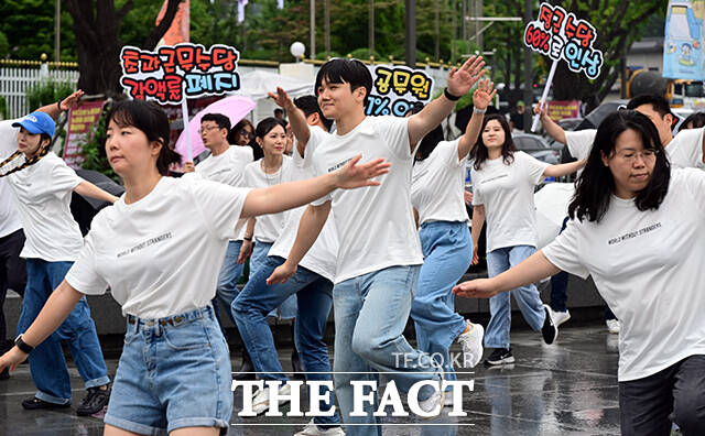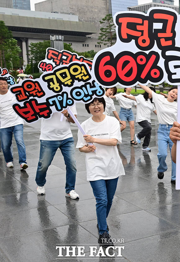 [더팩트ㅣ임영무 기자] 한국노총 소속 공무원 및 교사 60여명이 16일 오전 서울 종로구 정부서울청사 앞에서 공무원 보수 현실화를 촉구하는 플래시몹을 진행하고 있다.