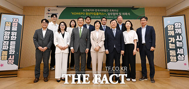 [더팩트ㅣ서예원 기자] 황영기 초록우산 회장과 이스란 보건복지부 제1차관, 이정복 한국서부발전 사장(앞줄 왼쪽 세 번째부터)이 16일 오전 서울 중구 초록우산어린이재단에서 열린 보건복지부와 한국서부발전, 초록우산이 함께 진행하는 'KOWEPO 청년자립플러스+' 업무협약 및 자문위원 위촉식에 참석해 기념 촬영을 하고 있다.