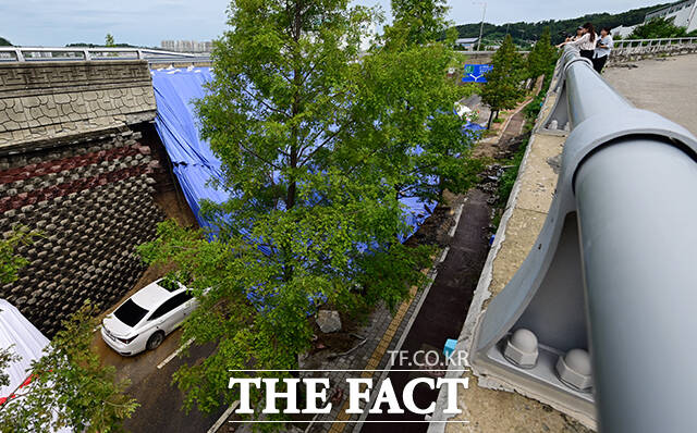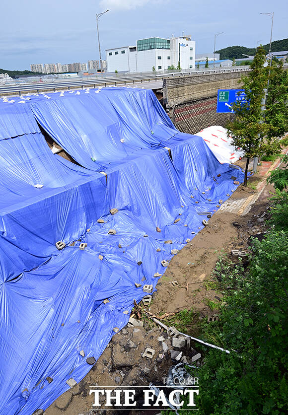 오산시는 1t의 모래주머니를 옹벽 주변에 보강하고 방수포를 덮어 2차 사고를 방지하기 위한 조치를 했다.