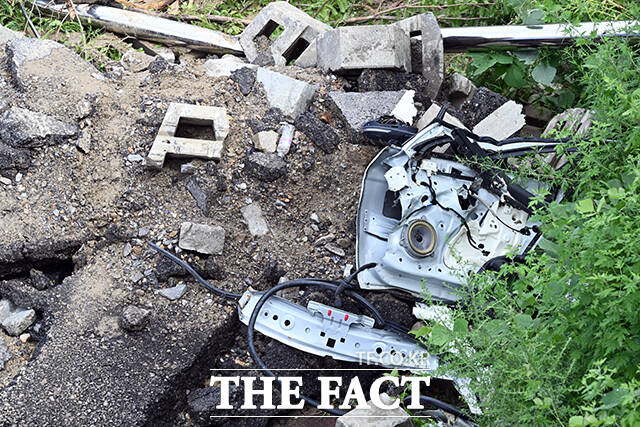 [더팩트ㅣ오산=임영무 기자] 16일 저녁 시간당 41mm의 강한 비로 옹벽을 지지하던 토사가 침하돼 차량을 덮치는 사고가 발생한 가운데 18일 오전 경기 오산시 가장동 가장교차로 인근 사고 현장에는 흘러내린 벽돌과 토사가 차량 앞부분을 뒤덮고 있다.