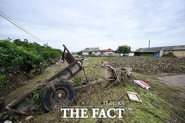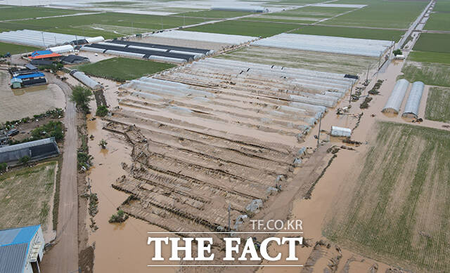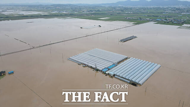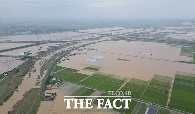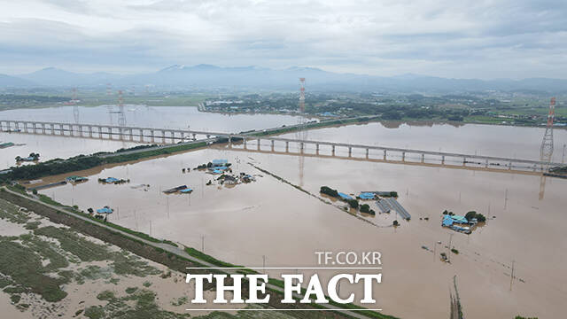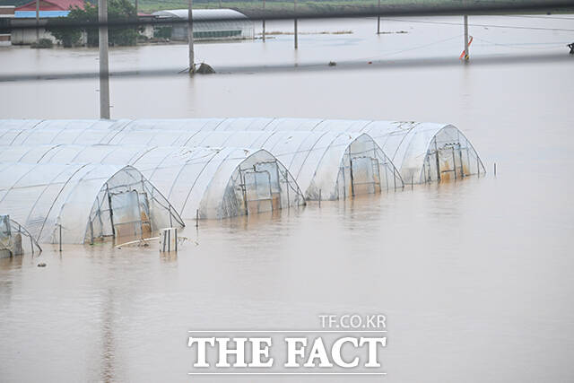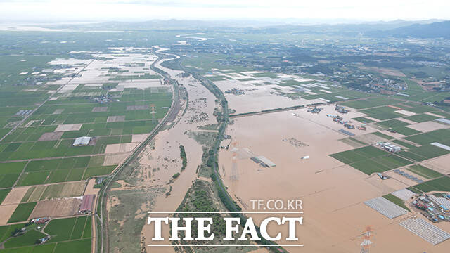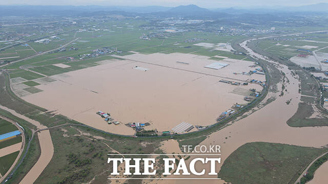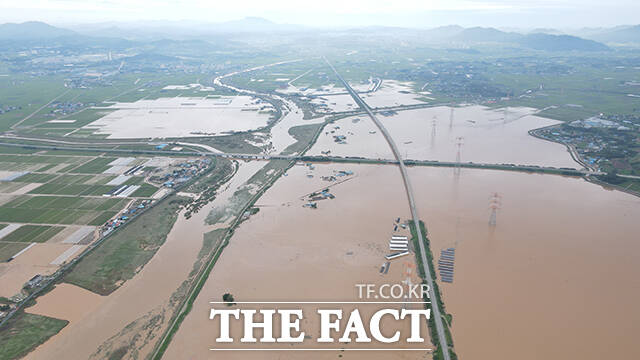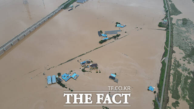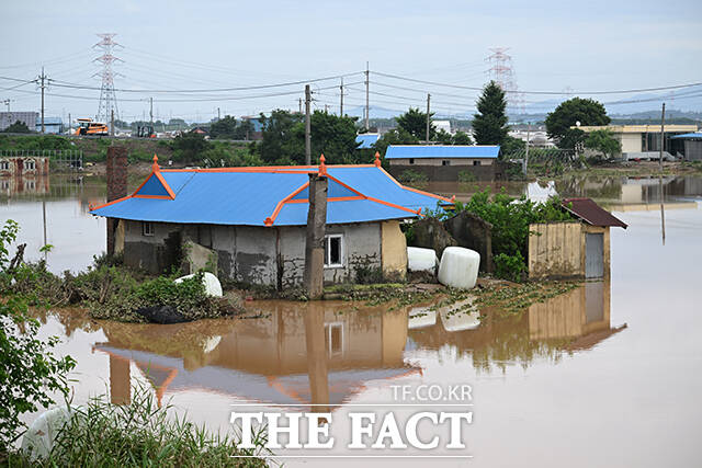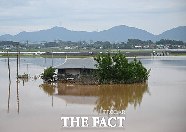 [더팩트|예산=박헌우 기자] 18일 오후 충남 예산군 삽교읍 일대가 집중호우로 침수돼 있다.