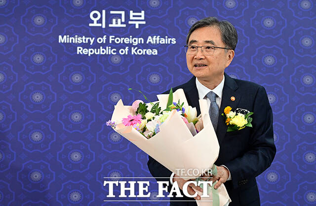 [더팩트ㅣ임영무 기자] 조현 신임 외교부 장관이 21일 오전 서울 종로구 외교부에서 열린 취임식에 참석해 직원으로부터 축하 꽃다발을 전달받고 미소 짓고 있다.darkroom@tf.co.kr사진영상기획부 photo@tf.co.kr