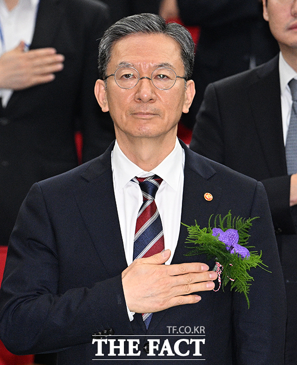 [더팩트|과천=박헌우 기자] 정성호 법무부 장관이 21일 오전 경기 과천시 정부과천청사에서 열린 제71대 법무부 장관 취임식에 참석해 국민의례를 하고 있다.