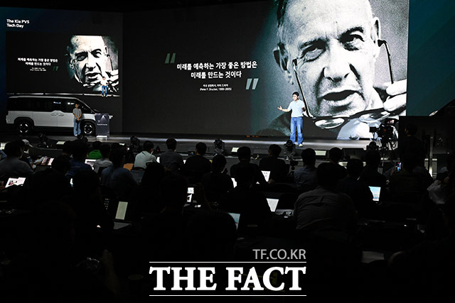 [더팩트ㅣ광명=남용희 기자] '더 기아 PV5 테크 데이'가 22일 오전 경기도 광명시 AK플라자 아이벡스 스튜디오에서 열린 가운데 주석하 연구개발본부 상무가 환영사를 하고 있다.