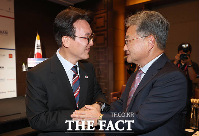 [더팩트ㅣ임영무 기자] 김민석 국무총리(왼쪽)가 22일 오후 서울 영등포구 콘래드서울 호텔에서 열린 주한미국상공회의소 (AMCHAM KOREA) 세미나에 참석해 조셉 윤 주한미국대사 대리와 악수를 나누고 있다.