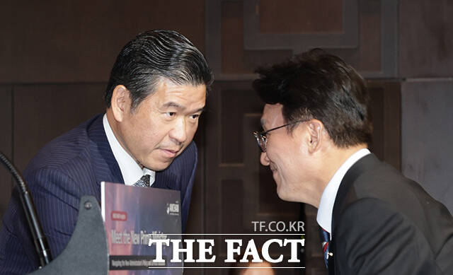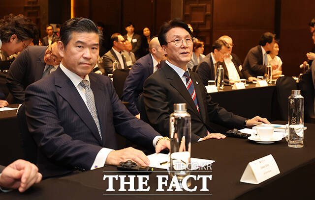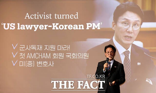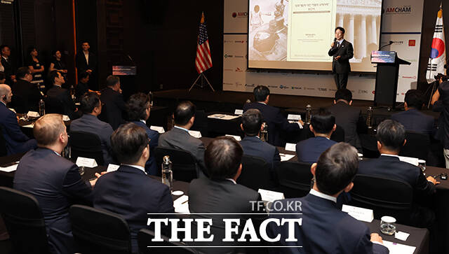 [더팩트ㅣ임영무 기자] 김민석 국무총리가 22일 오후 서울 영등포구 콘래드서울 호텔에서 열린 주한미국상공회의소 (AMCHAM KOREA) 세미나에 참석해 기조연설을 하고 있다.