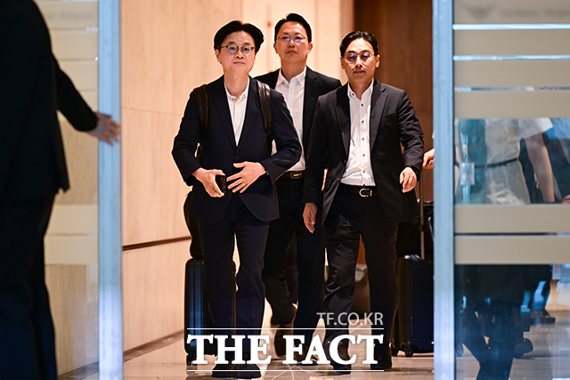 [더팩트ㅣ인천국제공항=남윤호 기자] 김정관 산업통상자원부 장관(왼쪽)이 23일 오전 인천국제공항에서 한미 관세 협상과 관련한 미국 출장에 나서고 있다.