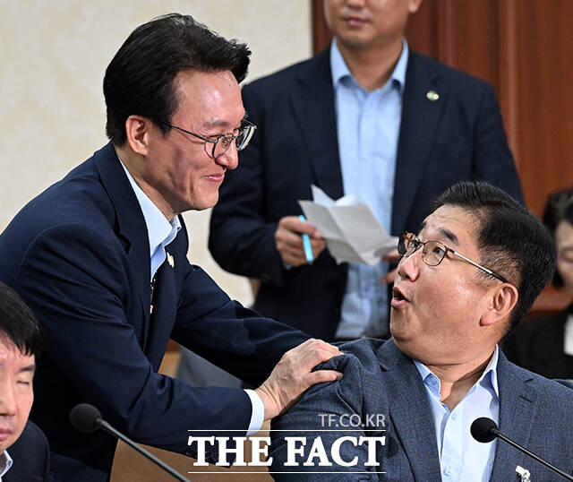 [더팩트ㅣ임영무 기자] 김민석 국무총리(왼쪽)가 23일 오전 서울 종로구 정부서울청사에서 열린 APEC 정상회의 종합점검회의에 참석해 박관천 경호처 차장 내정자와 인사를 나누고 있다.darkroom@tf.co.kr사진영상기획부 photo@tf.co.kr
