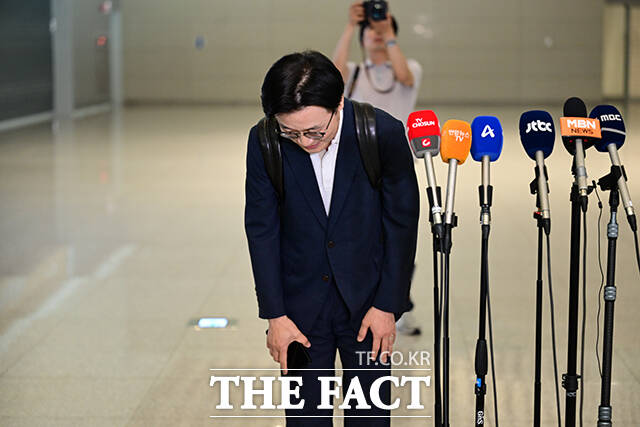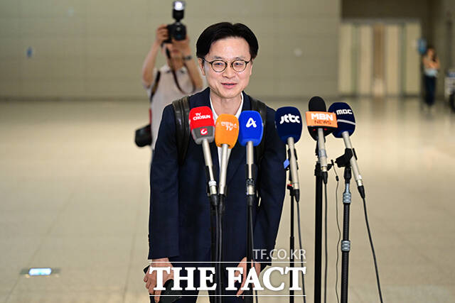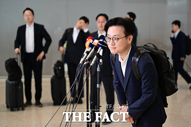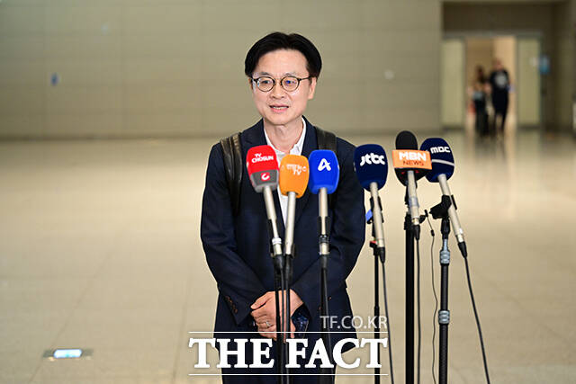 [더팩트ㅣ인천국제공항=남윤호 기자] 김정관 산업통상자원부 장관이 23일 오전 인천국제공항에서 한미 관세 협상과 관련한 미국 출장을 앞두고 취재진과 질의응답 시간을 갖으며 미소짓고 있다.