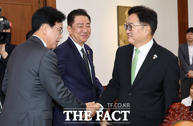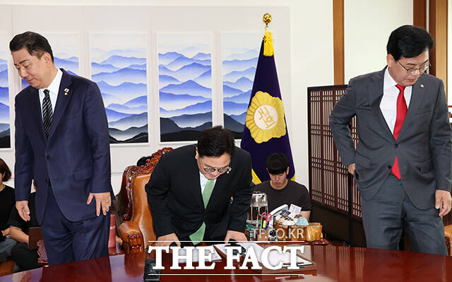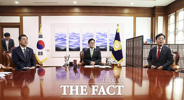[더팩트ㅣ국회=배정한 기자] 문진석 더불어민주당 원내수석부대표, 김병기 원내대표, 우원식 국회의장, 송언석 국민의힘 원내대표, 유상범 원내수석부대표(왼쪽부터)가 23일 오전 서울 여의도 국회에서 열린 여야원내대표 회동에 참석해 기념사진 촬영을 하고 있다.