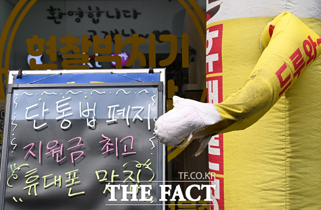 [더팩트ㅣ이새롬 기자] '이동통신 단말장치 유통구조 개선에 관한 법률' 이른바 단통법이 11년 만에 폐지된 가운데, 23일 서울의 한 휴대전화 판매점에 '단통법 폐지' 안내문이 붙어 있다.