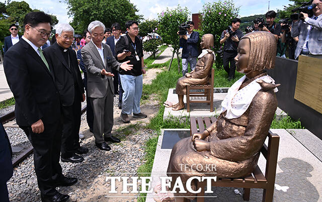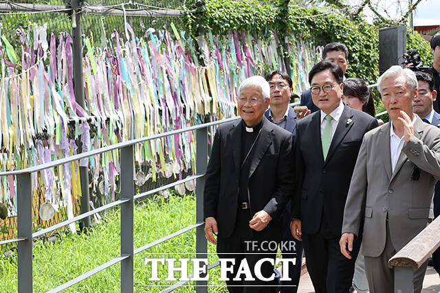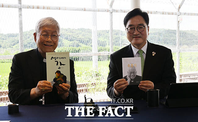 [더팩트ㅣ파주=배정한 기자] 우원식 국회의장(왼쪽 두번째)과 유흥식 추기경(왼쪽)이 23일 오전 경기 파주 임진각 평화누리공원에서 한반도 평화와 남북교류 복원을 위한 평화대담을 나누고 있다.