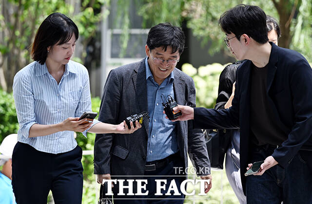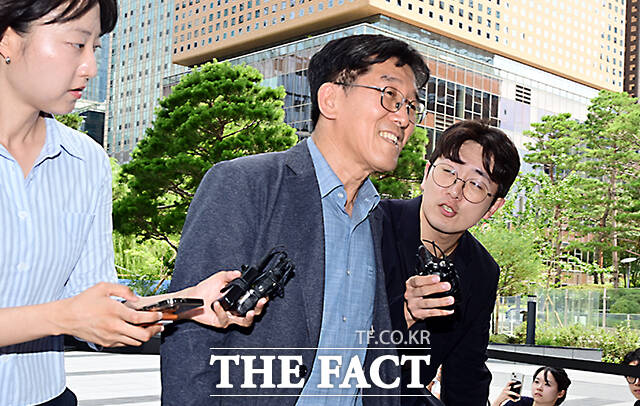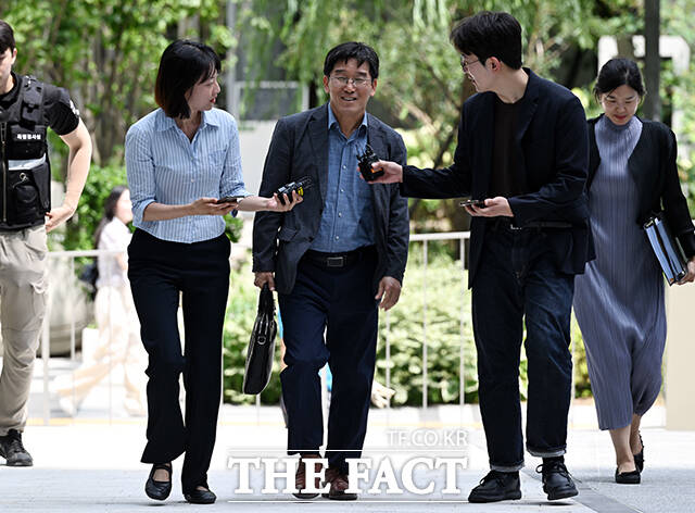 [더팩트ㅣ임영무 기자] 박춘원 JB우리캐피탈 대표(왼쪽)가 23일 오후 서울 종로구 KT광화문 웨스트에 마련된 김건희 특검 사무실로 출석하며 기자들의 질문을 받고 있다.