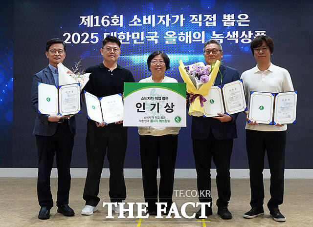 [더팩트ㅣ이효균 기자] 23일 서울 중구 명동 온드림 소사이어티에서 진행된 ‘2025 대한민국 올해의 녹색상품’ 시상식에서 ‘소비자가 직접 뽑은 인기상’ 수상자들이 유미화 올녹상 소비자평가위원장과 기념사진을 촬영하고 있다.