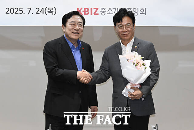 [더팩트ㅣ장윤석 기자] 김영훈 고용노동부 장관(오른쪽)이 24일 오전 서울 영등포구 중소기업중앙회를 방문해 김기문 중소기업중앙회 회장에게 꽃다발을 전달받고 있다.