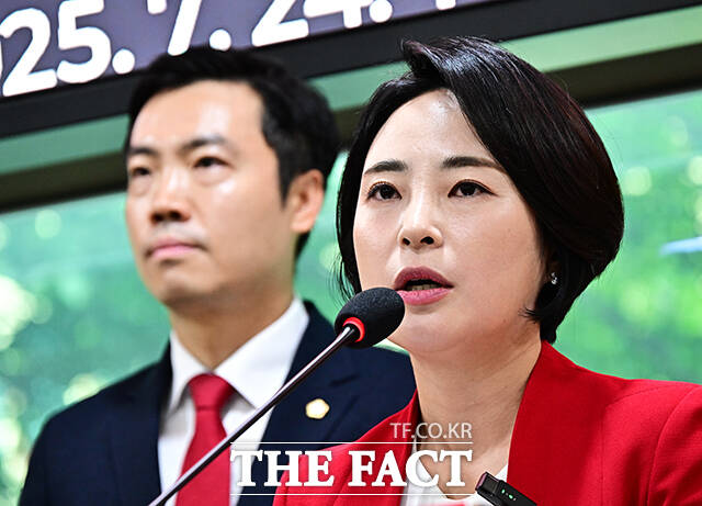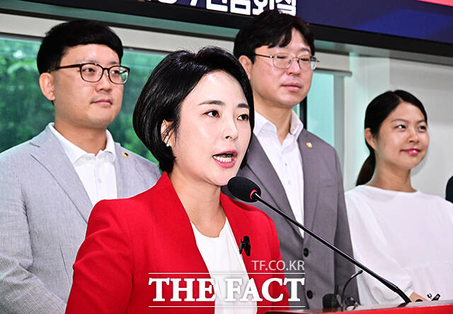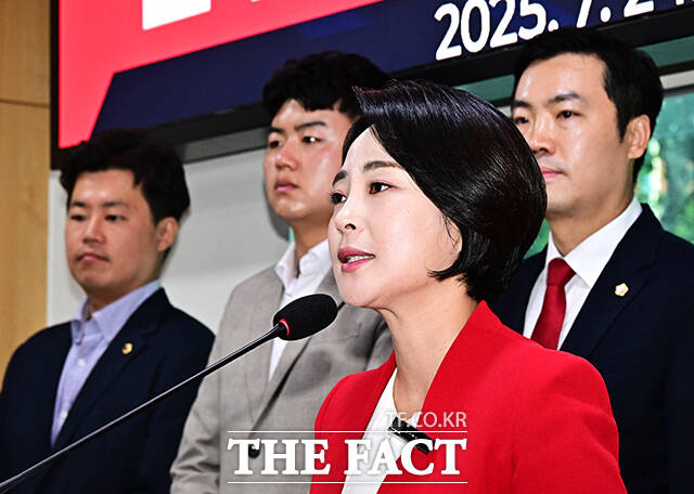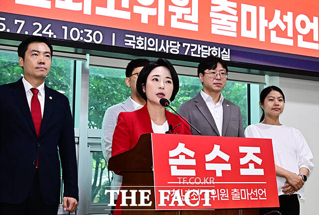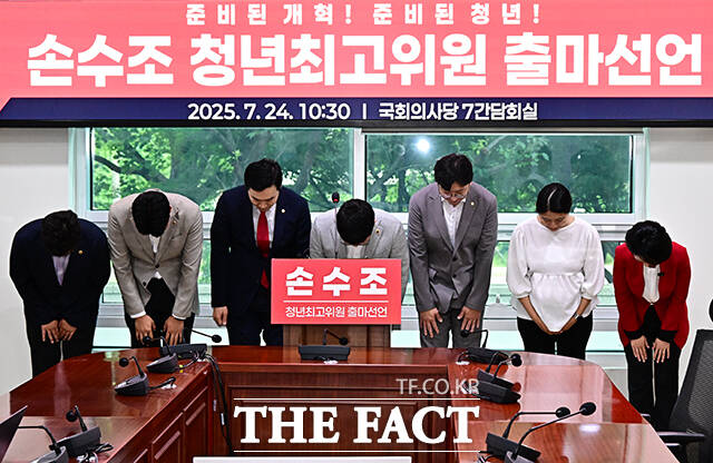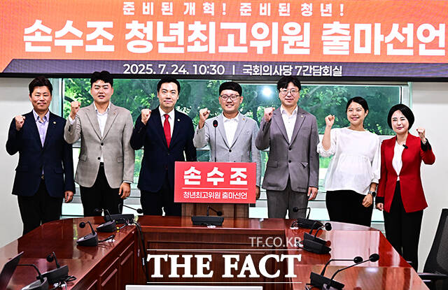 [더팩트ㅣ국회=배정한 기자] 손수조 리더스클럽 대표(가운데)가 24일 오전 서울 여의도 국회 의원회관에서 열린 국민의힘 전당대회 청년최고위원 출마선언 기자회견에 참석해 청년 지지자들과 함께 기념사진 촬영을 하고 있다.