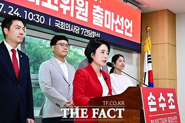 [더팩트ㅣ국회=배정한 기자] 손수조 리더스클럽 대표가 24일 오전 서울 여의도 국회 의원회관에서 기자회견을 열고 국민의힘 전당대회 청년최고위원 출마선언을 하고 있다.
