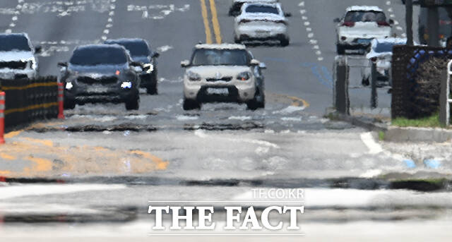[더팩트ㅣ박헌우 기자] 서울 전역에 폭염경보가 발효된 24일 오후 서울 송파구 송파대로 일대 도로에 아지랑이가 피어오르고 있다.