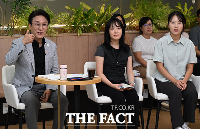 [더팩트ㅣ임영무 기자] 김민석 국무총리(왼쪽)가 24일 오후 서울 성동구 상상플래닛에서 열린 제1차 K-토론나라 '미래대화 1·2·3'에 참석해 모두발언을 하고 있다.