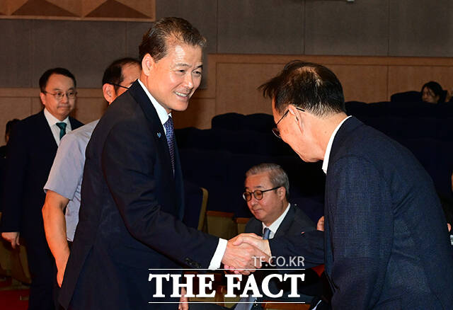 [더팩트ㅣ임영무 기자] 김영호 통일부 장관(왼쪽)이 25일 오후 서울 종로구 정부서울청사 별관에서 열린 이임식에 참석해 김남중 차관과 인사를 나누고 있다.darkroom@tf.co.kr사진영상기획부 photo@tf.co.kr