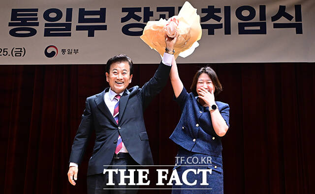 [더팩트ㅣ임영무 기자] 정동영 신임 통일부 장관(왼쪽)이 25일 오후 서울 종로구 정부서울청사 별관에서 열린 취임식에 참석해 직원으로부터 받은 꽃다발을 번쩍 들어올리고 있다.darkroom@tf.co.kr사진영상기획부 photo@tf.co.kr