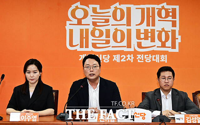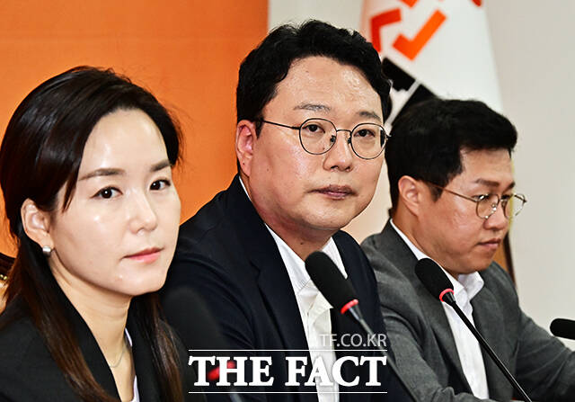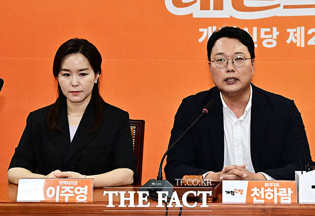 [더팩트ㅣ국회=배정한 기자] 천하람 개혁신당 원내대표가 28일 오전 서울 여의도 국회에서 이준석 대표 자택 압수수색 관련 긴급 기자회견을 열고 취재진의 질의에 답변을 하고 있다.