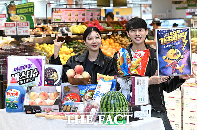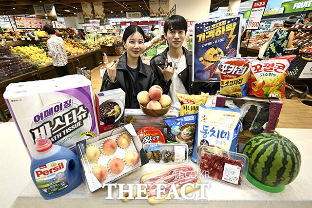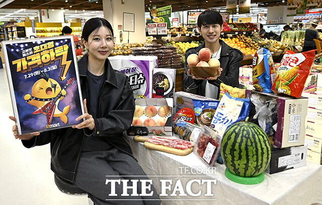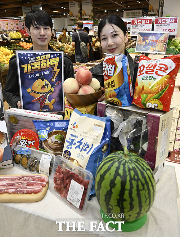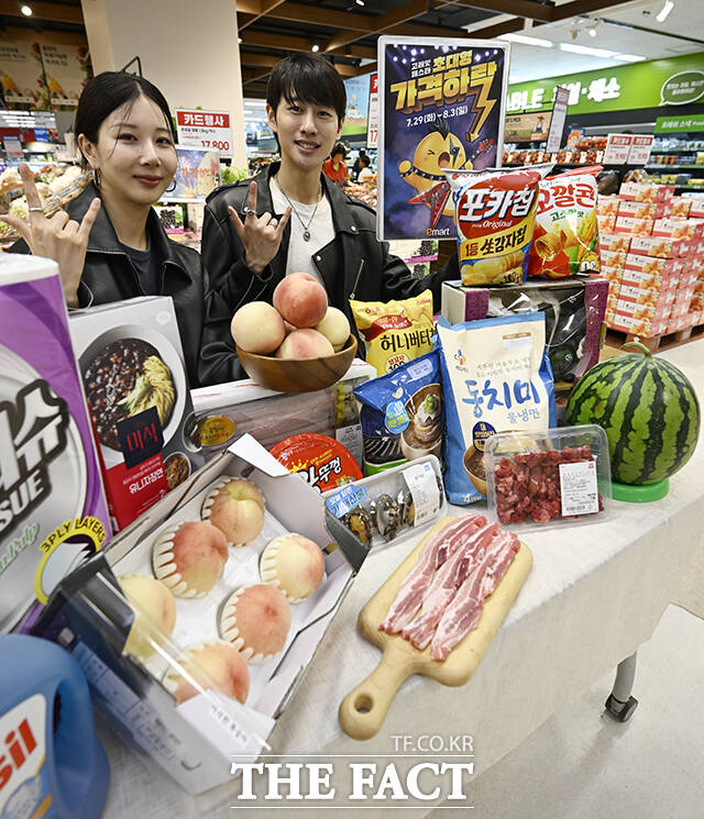 이마트가 '가격 하락도 락(樂)이다! 8월 고래잇 페스타’ 행사를 한다고 밝힌 28일 오전 서울 용산구 이마트 용산점에서 모델들이 행사 상품을 선보이고 있다. /장윤석 기자