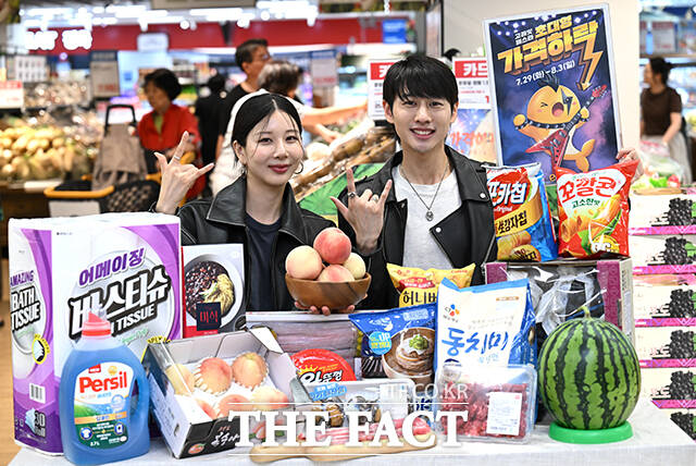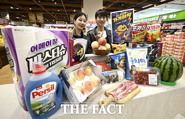 [더팩트ㅣ장윤석 기자] 이마트가 '가격 하락도 락(樂)이다! 8월 고래잇 페스타’ 행사를 한다고 밝힌 28일 오전 서울 용산구 이마트 용산점에서 모델들이 행사 상품을 선보이고 있다.