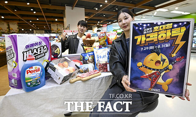 [더팩트ㅣ장윤석 기자] 이마트가 '가격 하락도 락(樂)이다! 8월 고래잇 페스타’ 행사를 한다고 밝힌 28일 오전 서울 용산구 이마트 용산점에서 모델들이 행사 상품을 선보이고 있다.