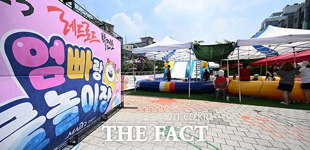 [더팩트ㅣ서예원 기자] 어린이들이 28일 오전 서울 마포구 레드로드발전소에 마련된 '2025 마포 엄빠랑 물놀이장'에서 물놀이를 즐기고 있다.