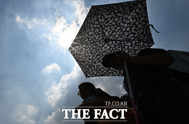 [더팩트ㅣ박헌우 기자] 전국 대부분 지역에 폭염이 이어지고 있는 28일 오전 서울 종로구 세종대로에서 시민이 양산을 쓰고 걷고 있다.