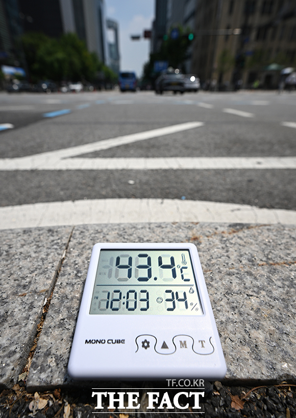 [더팩트ㅣ박헌우 기자] 전국 대부분 지역에 폭염이 이어지고 있는 28일 오전 서울 종로구 세종대로에 놓아둔 온도계가 43.4도를 나타내고 있다.