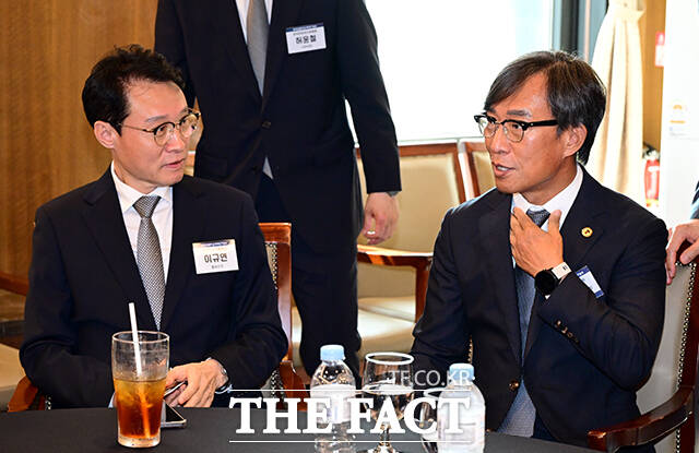 이규연 홍보수석과 대화 나누는 김기정 회장 [포토]