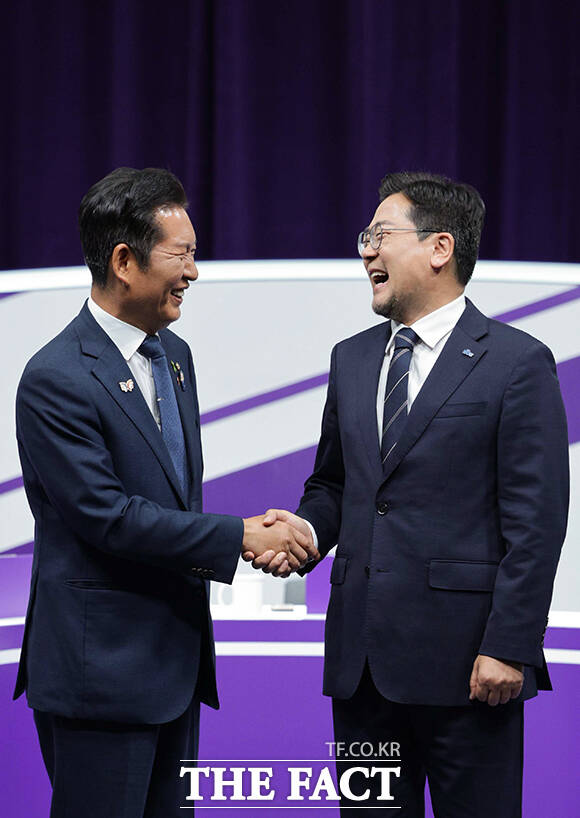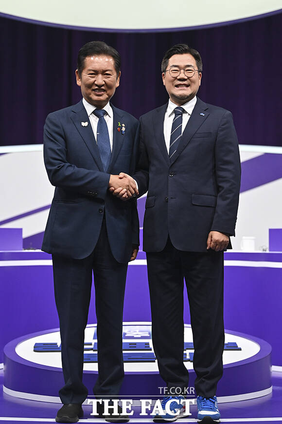 [더팩트ㅣ국회사진기자단] 정청래(왼쪽), 박찬대 더불어민주당 대표 후보들이 29일 오후 서울 마포구 MBC에서 예정된 TV토론회에 앞서 기념촬영을 하며 호탕하게 웃고 있다.
