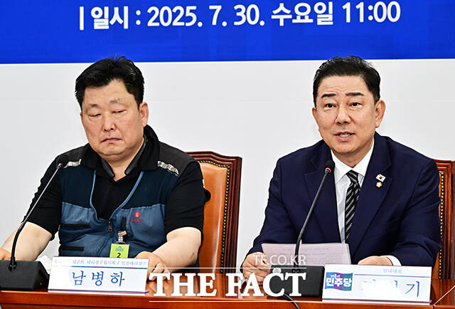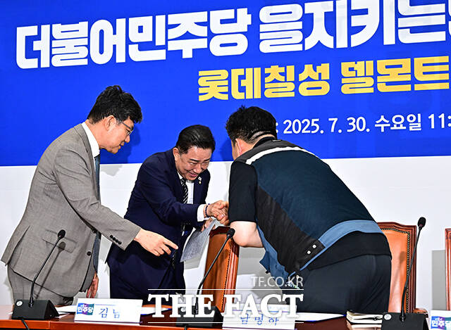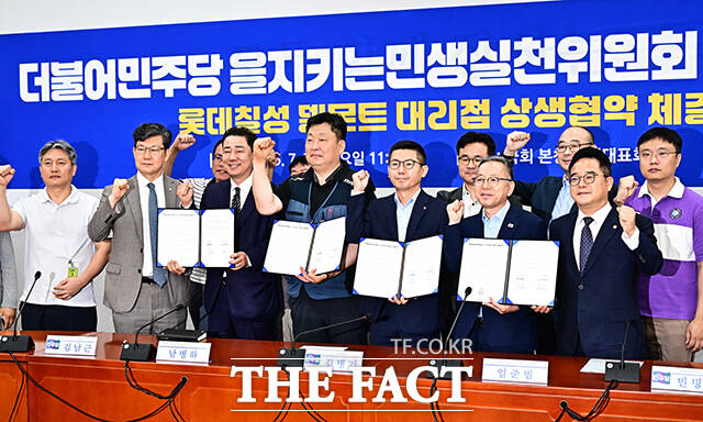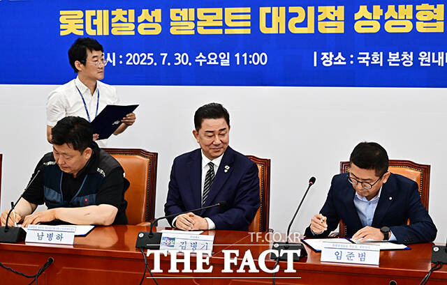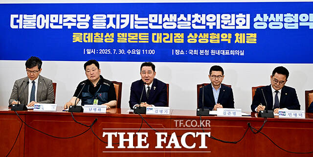 [더팩트ㅣ국회=배정한 기자] 김병기 더불어민주당 당대표 직무대행 겸 원내대표와 남병하 롯데칠성 델몬트 인천대리점주, 임준범 롯데칠성음료 상무이사(왼쪽 네번째부터)가 30일 오전 서울 여의도 국회에서 열린 을지로위원회 롯데칠성 델몬트 대리점 상생협약식에 참석해 기념사진 촬영을 하고 있다.