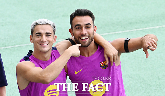 [더팩트|고양종합운동장=박헌우 기자] FC바르셀로나 파블로 가비(왼쪽)와 에릭 갸르시아가 30일 오후 경기 고양시 고양종합운동장에서 취재진을 바라보며 미소짓고 있다.