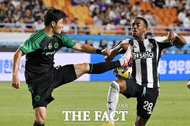 [더팩트ㅣ수원월드컵경기장=남용희 기자] 박진섭(왼쪽)과 조 윌록이 30일 오후 경기도 수원시 팔달구 수원월드컵경기장에서 열린 팀 K리그와 뉴캐슬 유나이티드의 쿠팡플레이 시리즈 1경기에서 볼다툼을 하고 있다.