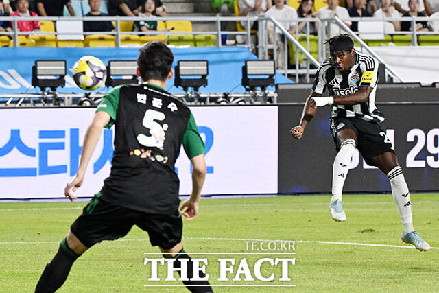 [더팩트ㅣ수원월드컵경기장=남용희 기자] 안토니 엘랑가가 30일 오후 경기도 수원시 팔달구 수원월드컵경기장에서 열린 팀 K리그와 뉴캐슬 유나이티드의 쿠팡플레이 시리즈 1경기에서 슈팅을 시도하고 있다.