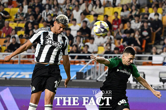 [더팩트ㅣ수원월드컵경기장=남용희 기자] 윌 오술라(왼쪽)가 30일 오후 경기도 수원시 팔달구 수원월드컵경기장에서 열린 팀 K리그와 뉴캐슬 유나이티드의 쿠팡플레이 시리즈 1경기에서 헤더를 시도하고 있다.