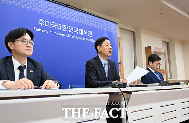 [더팩트ㅣ임영무 기자] 구윤철 부총리 겸 기획재정부 장관이 30일 저녁(현지시간) 미국 워싱턴 주미한국대사관에서 한-미 통상협의 결과를 브리핑하고 있다.