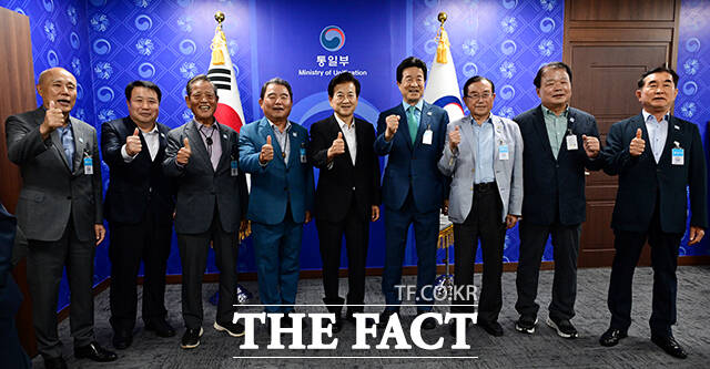 [더팩트ㅣ임영무 기자] 정동영 통일부 장관(가운데)이 31일 오후 서울 종로구 정부서울청사에서 열린 개성공단기업협회 회장단과의 면담에 앞서 조경주 개성공단기업협회장 및 기업 회장들과 기념촬영을 하고 있다.