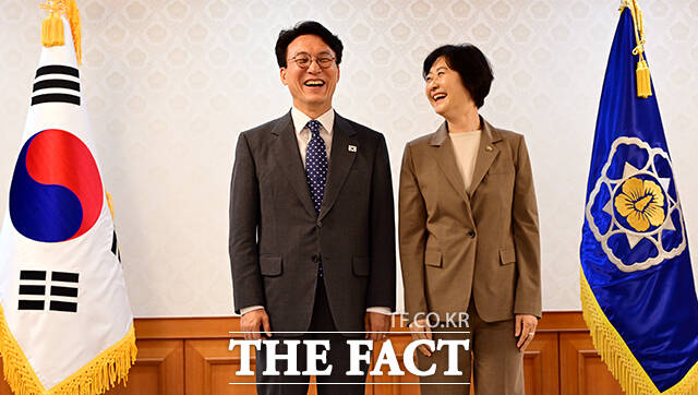[더팩트ㅣ임영무 기자] 김민석 국무총리(왼쪽)가 31일 오후 서울 종로구 정부서울청사에서 열린 차관급 임명장 수여식에 참석해 이스란 보건복지부 1차관과 기념촬영을 하고 있다.