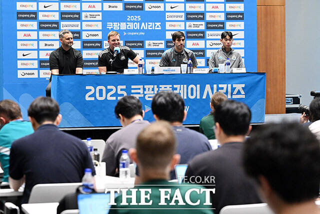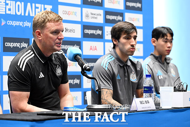 [더팩트ㅣ남용희 기자] 에디 하우 뉴캐슬 유나이티드 감독과 박승수, 산드로 토날리(왼쪽부터)가 2일 오후 서울 여의도 IFC 더 포럼에서 열린 2025 쿠팡플레이 시리즈 뉴캐슬 기자회견에서 기념촬영을 하고 있다.